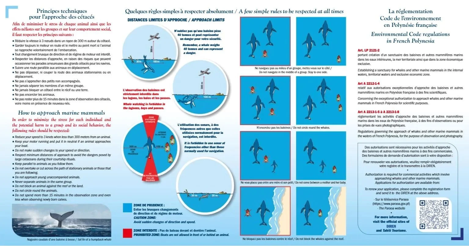 Whale watching is a strictly regulated activity in French Polynesia and only accredited professionals are authorized to organize excursions. There is a distance of 100M security that must be respected, you are not allowed to swim towards the whales, they must decide to swim towards you. Being in the company of these peaceable giants is a moving experience that leaves an indelible mark on everyone who has ever had that privilege.
