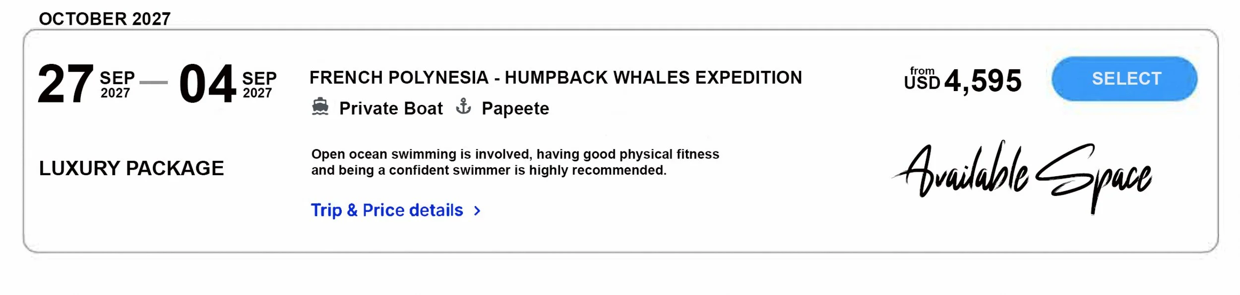 29th September - Day Three - Tahiti Island - Whale Watching - We will snorkel full day, looking for whales on private boat,