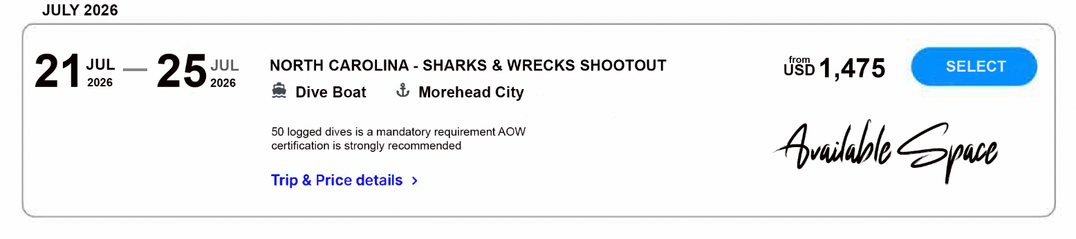We're teaming up with the legendary Mike Gerken, owner of Evolution Diving and the mastermind behind the annual Wreck/Shark Photography & Videography Shootout. Over four days and five nights, you'll dive iconic wrecks, swim alongside toothy giants, and compete for some seriously impressive prizes.