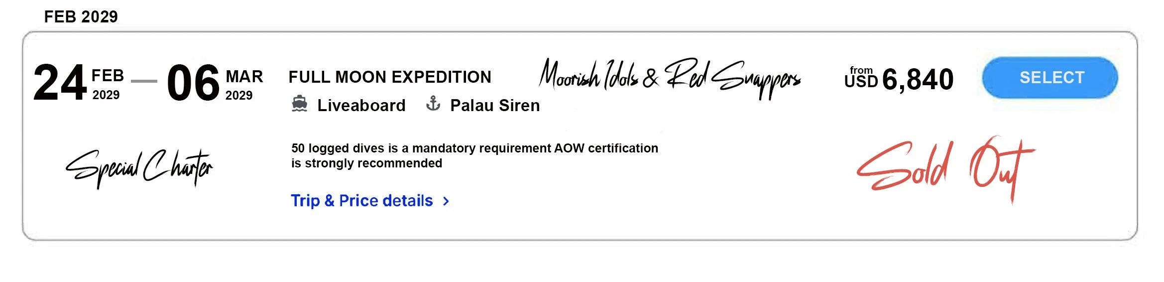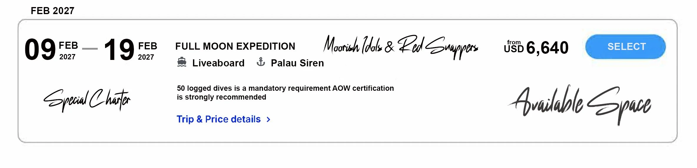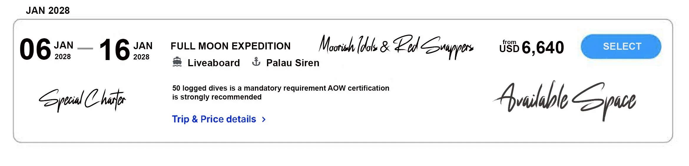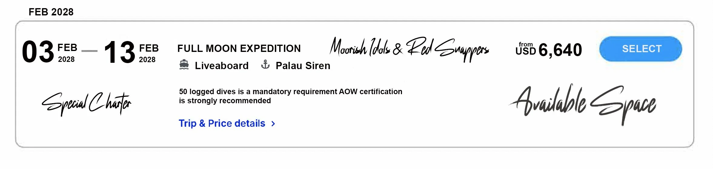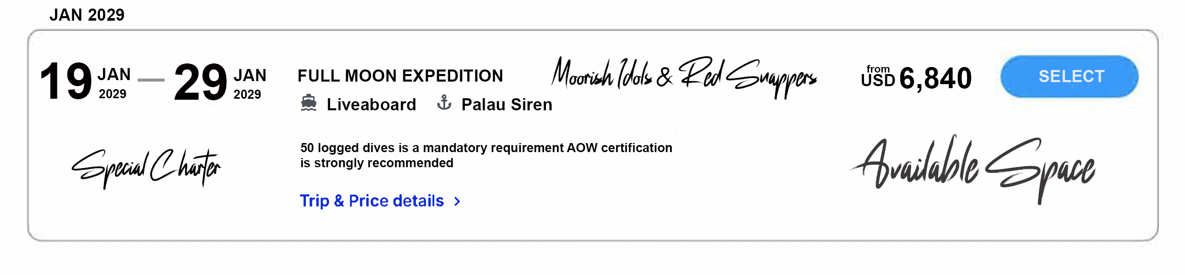 This COMBO spawning expedition is a double spawning trip of the Morish Idols and the Twin Spot Snappers. This is a special spawning trip as it is only possible to do this expedition twice a year once in January and once in February. Both options of either a Live-aboard expedition or a Land-based expedition are possible. Early morning and optional late night dives are involved on this expedition as well.