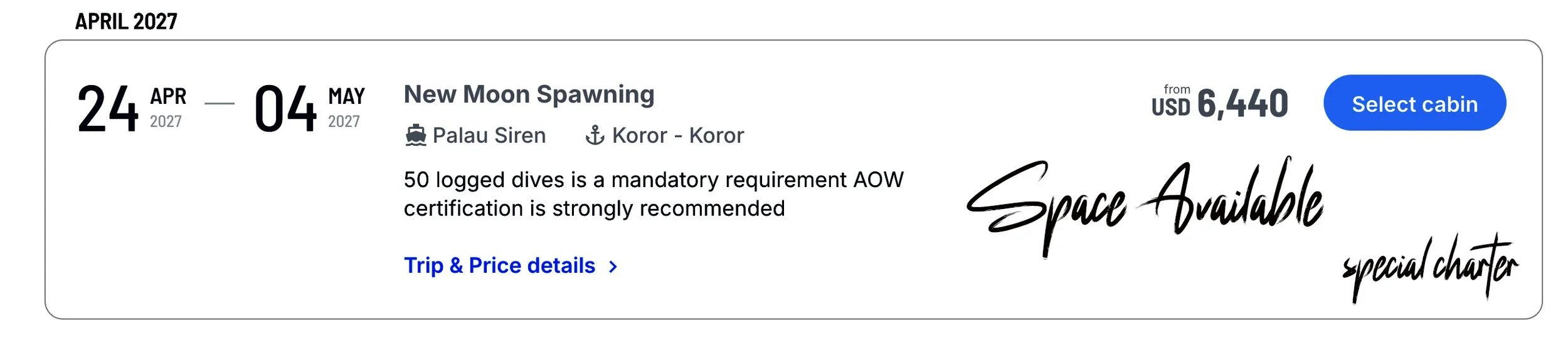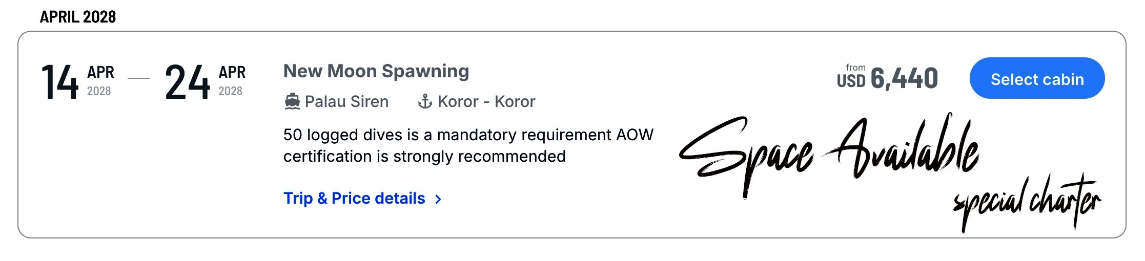 This COMBO spawning expedition is a double spawning trip of the Blue Lined Sea Bream and the Bumphead Parrotfish. This is a special spawning trip as it is only possible to do this expedition twice a year once in March and once in April. Both options of either a Live-aboard expedition or a Land-based expedition are possible. Early morning and optional late night dives are involved on this expedition.