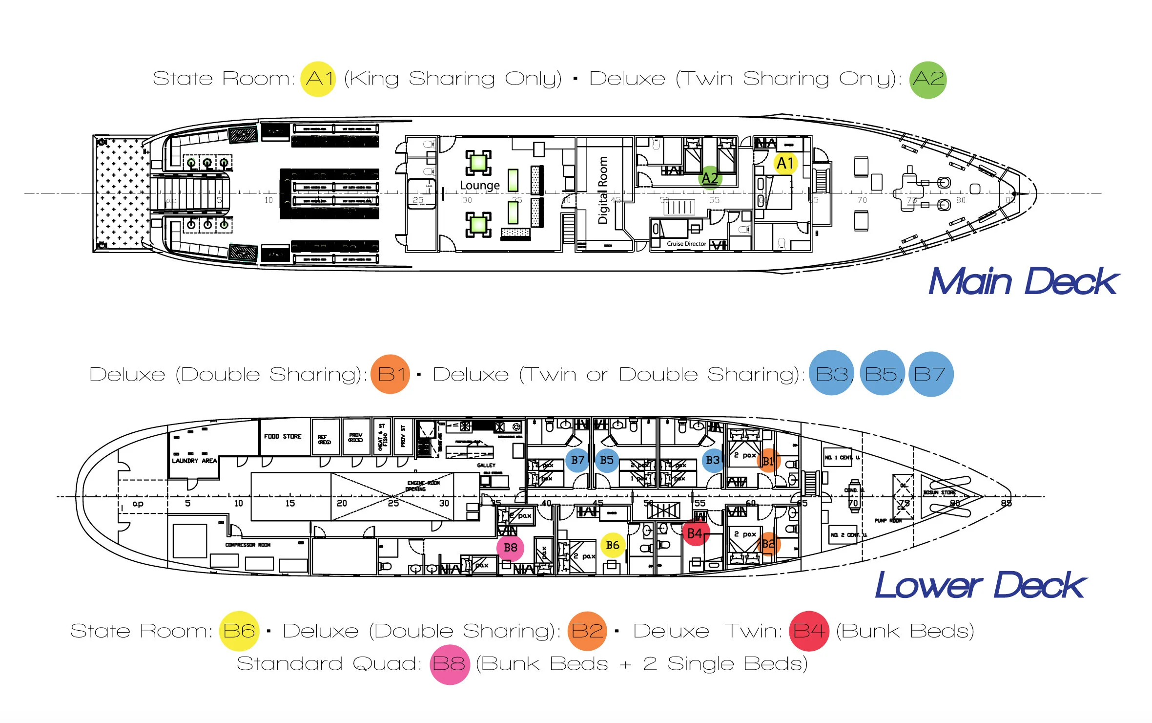 DELUX TWIN CABIN - Cabin B3, B5 & B7 : Twin or Double Sharing Cabin B4 : Twin Sharing *Bunk Beds All cabins are designed to provide adequate living and storage space for two individuals.