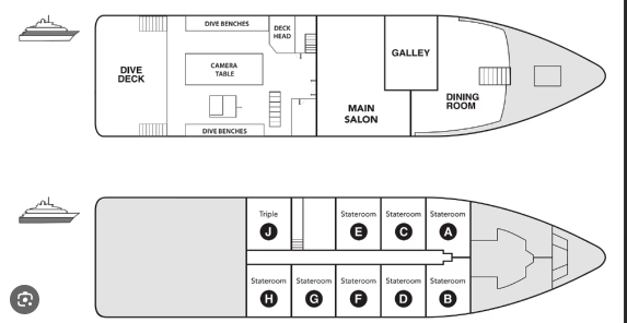 The Triple Stateroom on the Nautilus Explorer is designed for comfort and practicality, making it a great choice for friends or solo travelers looking to share. Located on the lower deck, it features three individual beds—two in a bunk-style arrangement and one side-by-side—along with ample storage space for personal belongings and dive gear. The cabin includes a private en suite bathroom with a shower, ensuring convenience and privacy after a day of diving. With efficient use of space and cozy accommodations, it offers a comfortable home base while you explore the incredible underwater world of Socorro and beyond.